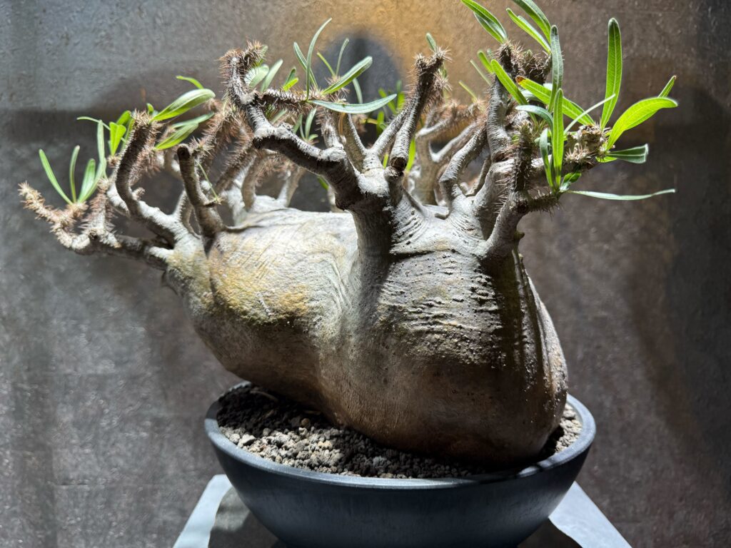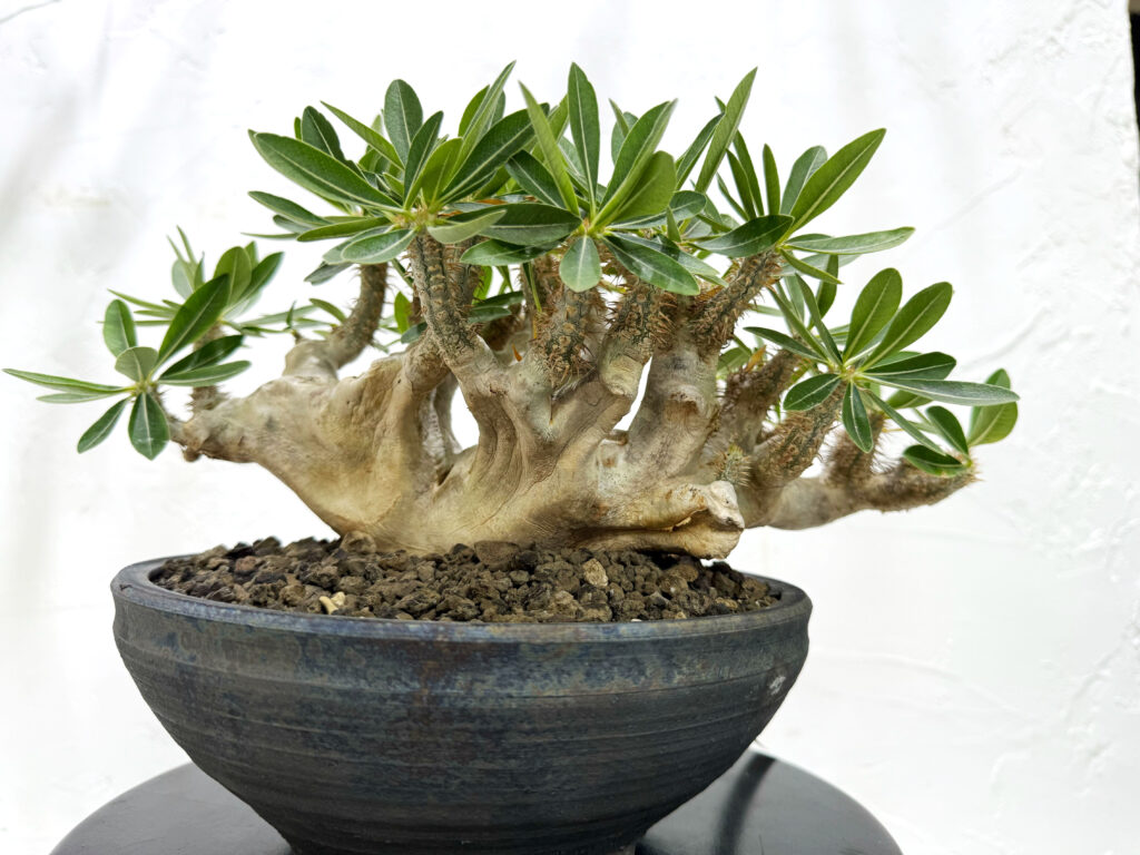 水やりはやや控えめが基本です。 幹に水を蓄えられるため、水のやりすぎは根腐れの原因になります。土が完全に乾いてからたっぷりと。特に、幹を太らせたい場合は、成長期に水を与えすぎず、厳しめに管理することで引き締まった株になります。